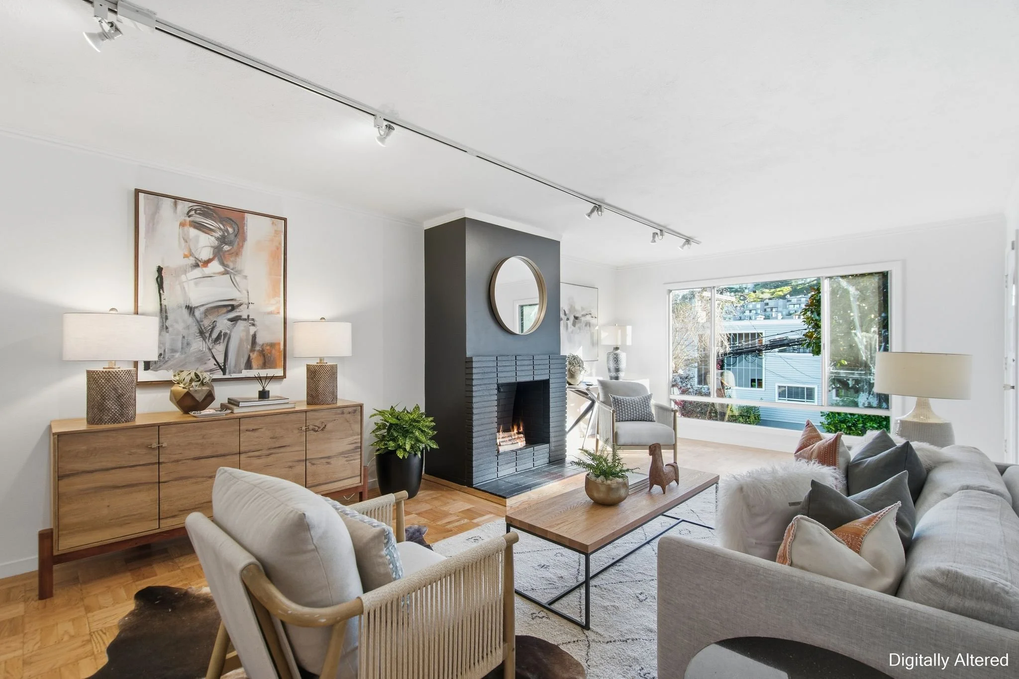 Sun‑washed, spacious living room with wood‑burning fireplace and parquet floors